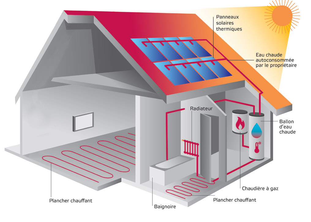 - Le circuit de transfert : Un fluide caloporteur transporte cette chaleur jusqu'à un ballon d'eau chaude.